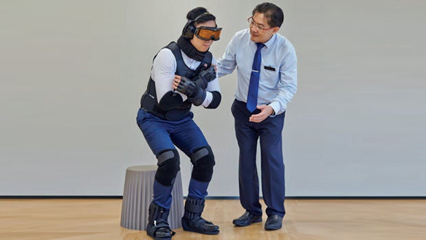 Some 20kg to 30kg are piled on to simulate loss of muscle strength. Straps stiffen his joints and restrict his movements to show him what arthritis feels like. A device covers the soles of his feet to simulate a loss of sensation in his feet (as in the case of diabetes) so that he can hardly feel the ground he walks on.