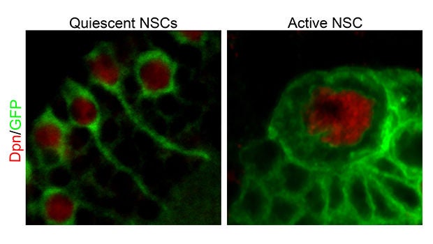 Drosophila neural stem cells (NSCs) in a dormant state (left panel) are unable to divide and generate neurons. An active NSC (right panel) produces many smaller progeny surrounding it. Deadpan (Dpn, in red) is an NSC marker. Cell outline of NSCs is marked by a green fluorescent protein (GFP). PHOTO: YE SING TAN and QIANNAN DENG