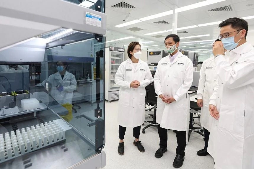 Health Minister Ong Ye Kung (second from left) being briefed during his visit to one of Mirxes' laboratories. BT PHOTO: YEN MENG JIN