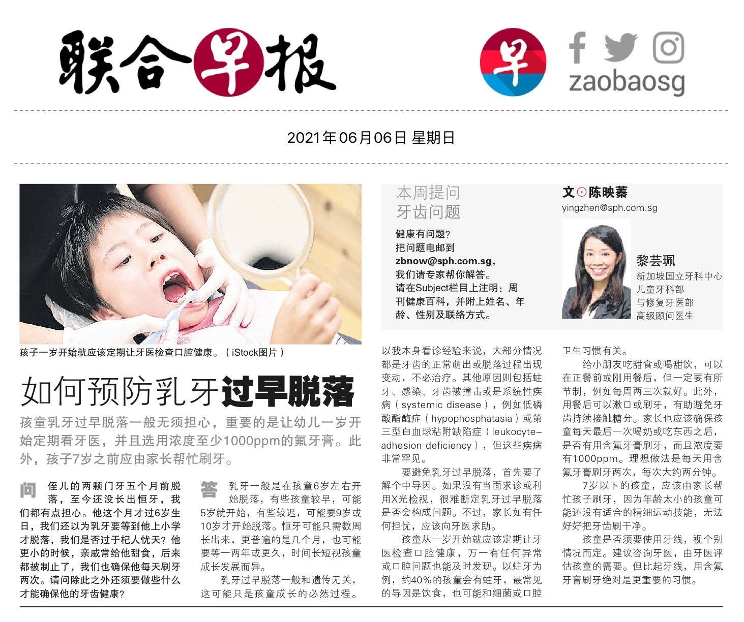 Dr Bien Lai from NDCS's Paediatric Dentistry Unit advised that children start to lose their primary teeth around 6 years old – some may start as early as 5 years old, or as late as 9 or 10 years old. Depending on growth and development, permanent teeth can grow out in a few weeks, or take as long as 1 or 2 years. Early loss of primary teeth can be due to normal development, tooth decay, infection, trauma or systemic disease. She also advised that parents should take their child to the dentist to seek help if they are concerned about their child losing teeth early. Dr Lai also highlighted that children should see the dentist by age 1, so that any abnormalities can be picked up early. She also mentioned that about 40% of preschoolers have tooth decay, and recommended not giving sweet treats more than 2 to 3 times weekly, and to brush with 1000ppm fluoridated tooth paste after the last meal or milk feed. Adults should carry out brushing for children under 7 years old, to ensure that teeth are well cleaned.